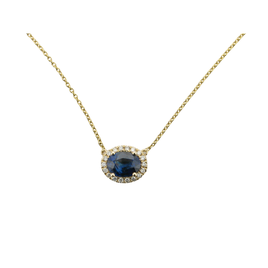14K Yellow Gold Oval 1.45CT Blue Sapphire with18=.12CTW SI GH Round Diamonds. 8X6MM Oval Sapphire. 18" Chain with Lobster Clasp