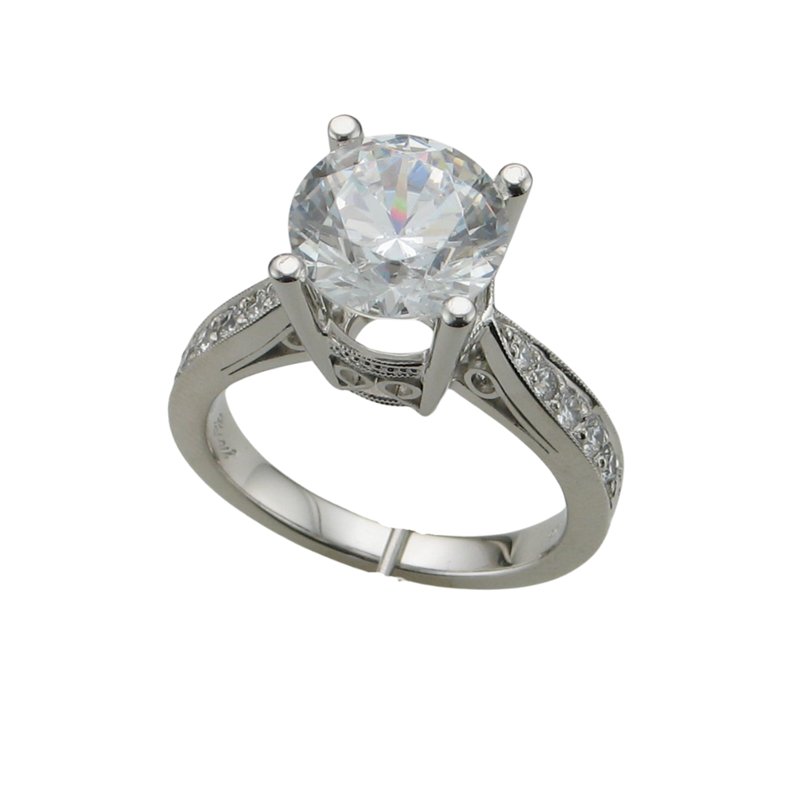 LADIES 3CT ROUND CENTER STONE (9.5MM RND C/Z) AND 10=.24TW SI1 G-H DIAMONDS. PLATINUM FILGREE REVERSE HEART RING IN FINGER SIZE 6.5