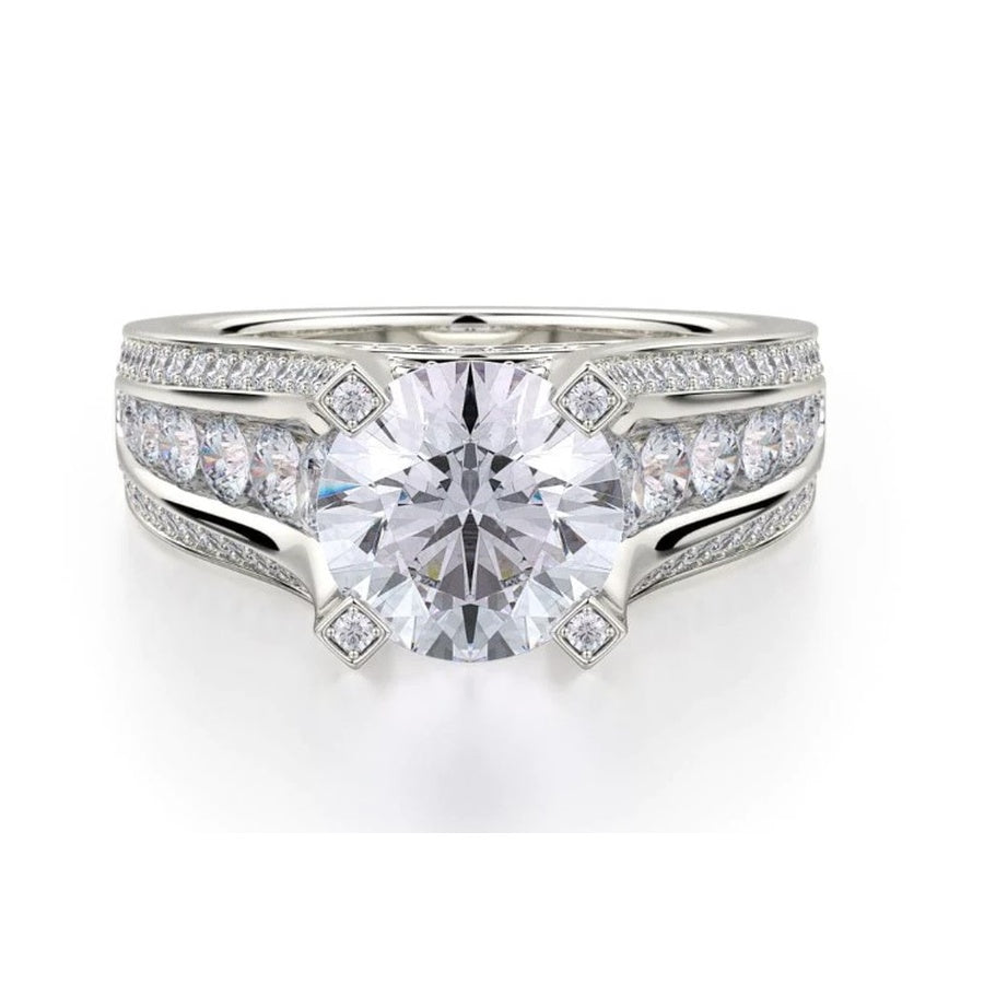 2.00CT(8MM) Round C/Z center Stone with 112=1.29ctw Diamonds down the wide 18K White Gold Foundation. Finger Size 6.5