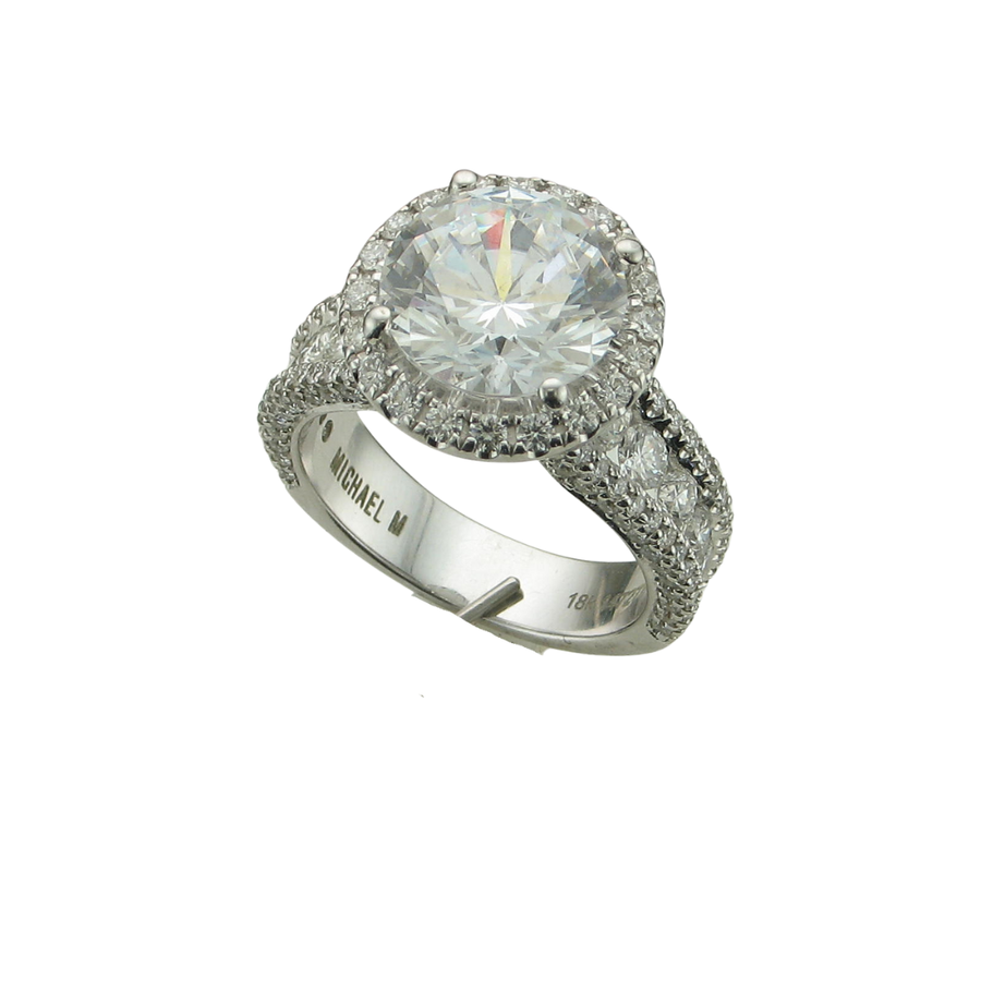 Classic and timeless, Loud R769-4 features a 4ct round center C/Z, nestled within a round diamond halo. An elegantly shaped shank, 158=2.04TW VS G pavéd on all sides encases an inner row of channel-set stones for a luxurious touch and makes up the over 2cts of stones used on this showstopper. 18K White Gold in Finger size 6.5