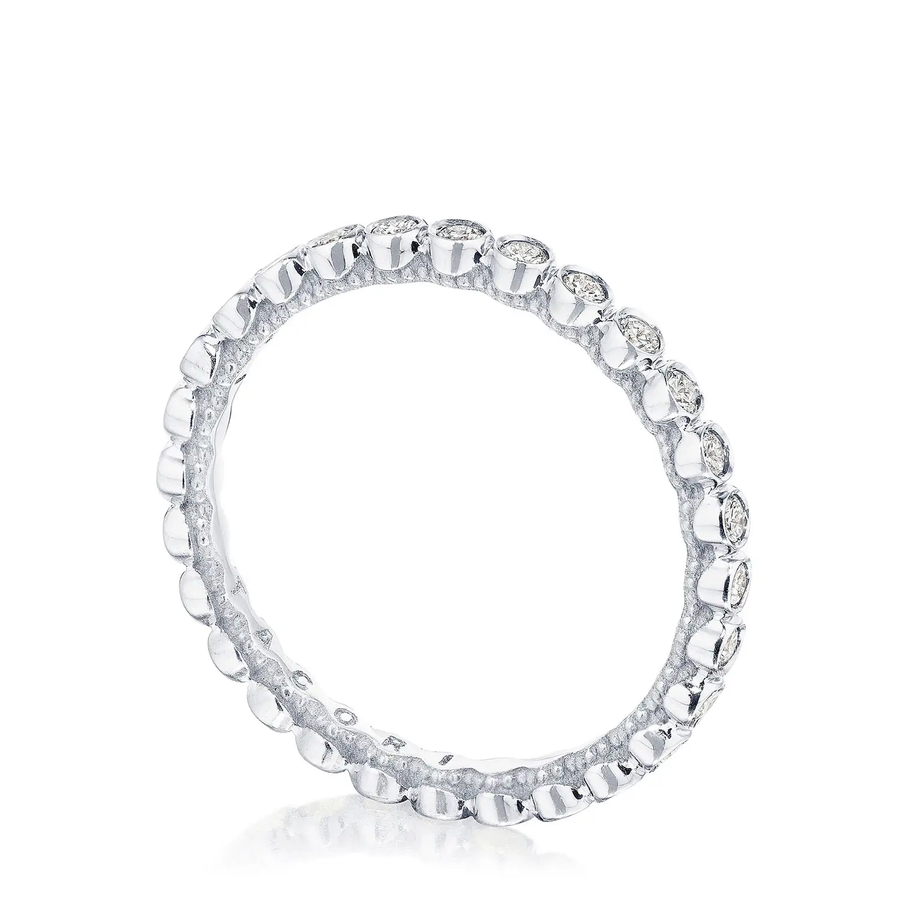 Take her breath away with a beautiful round diamond bezel set wedding band letting each diamond droplet represent a loving memory that only the two of you know. Set within 18K white gold, this string of diamonds is simply irresistible. .38ctw in matching VS G diamonds