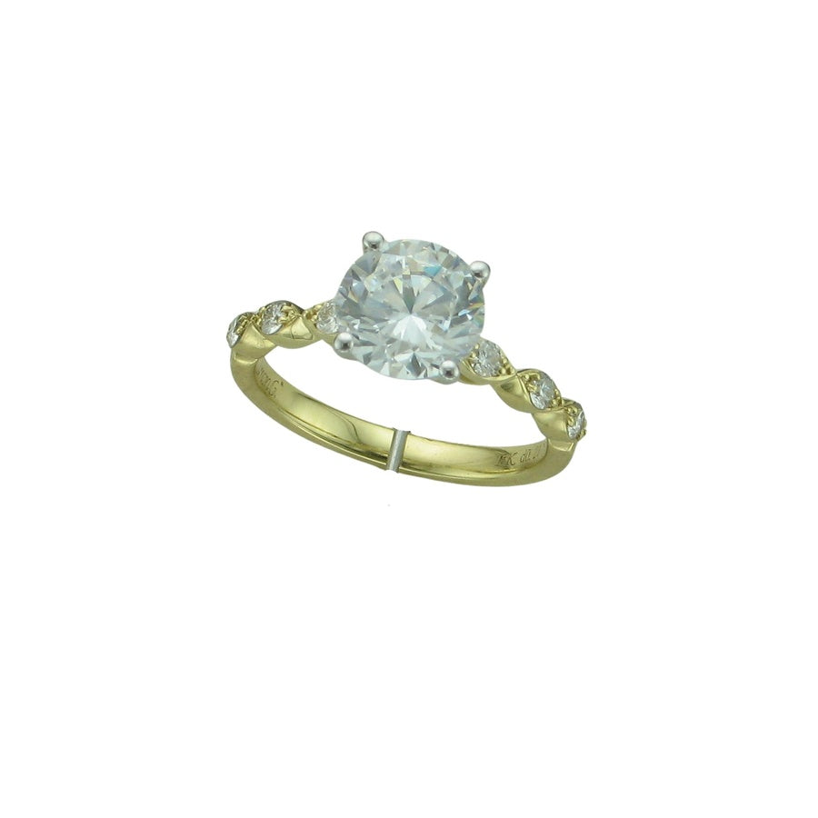2CT (8MM) Round Cut Cubic Zirconia set in two-toned gold ring. This stunning engagement ring features intricate clusters set with 6=.21CTW VS2 G sparkling diamonds along the shank. Finger size 6.5.