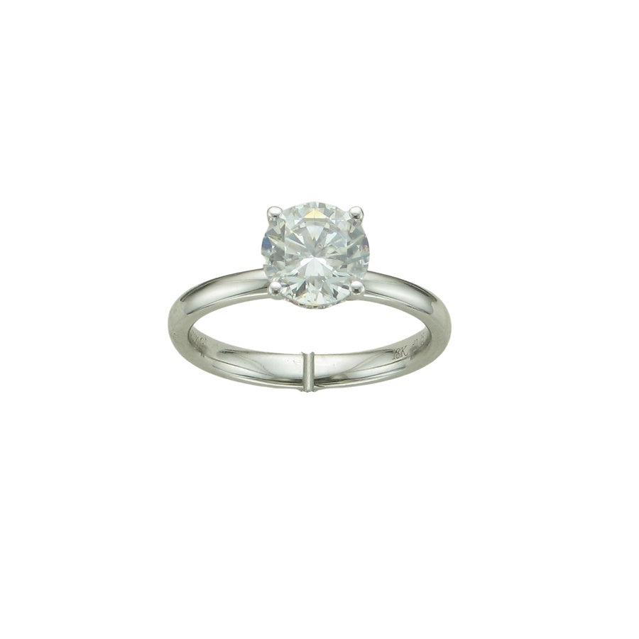 1.50CT(7.5MM) Round Cut Cubic Zirconia center stone set in 18K White Gold ring. This simple yet dazzling engagement ring features an elegant and classic design set with 16=.05CTW VS2 G brilliant diamonds in the hidden halo. Finger size 6.5