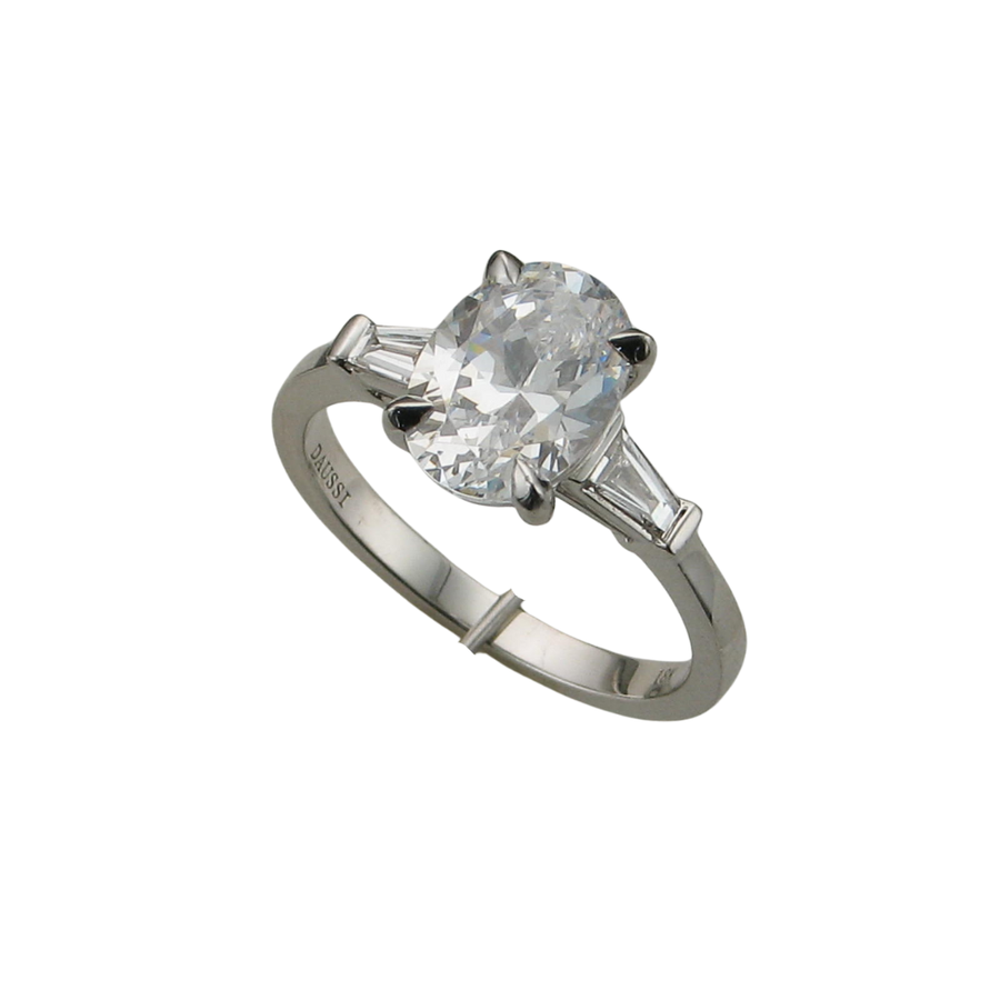 2.75CT(9.5 X 7mm )Oval CZ center stone with 2=.25ctw SI1 F Tapered Baguette Diamonds. Set in 18K White gold. Finger Size 6.5