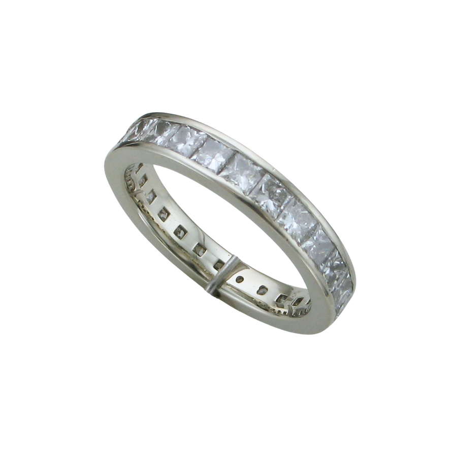 Ladies 18kt White Gold Princess Cut Diamond Channel Set Eternity Ring. It contains 26 Princess Cut Diamonds of SI1-SI2 avergae clarity and G-H color. The ring has a slight taper (4.1mm o 3.55mm) and has 3 slightly chipped diamonds. Finger size is 8.