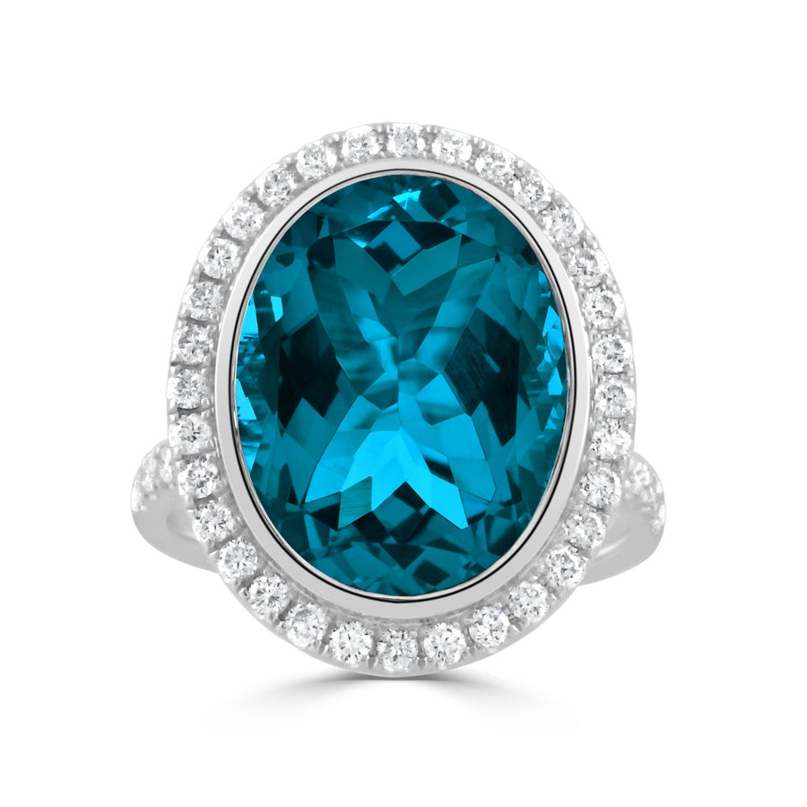 18KW London Blue Topaz Ring. 11.13ct Oval, Bezel set with diamond halo and straight diamond band 44=0.60ctw. Finger size is 6.5.