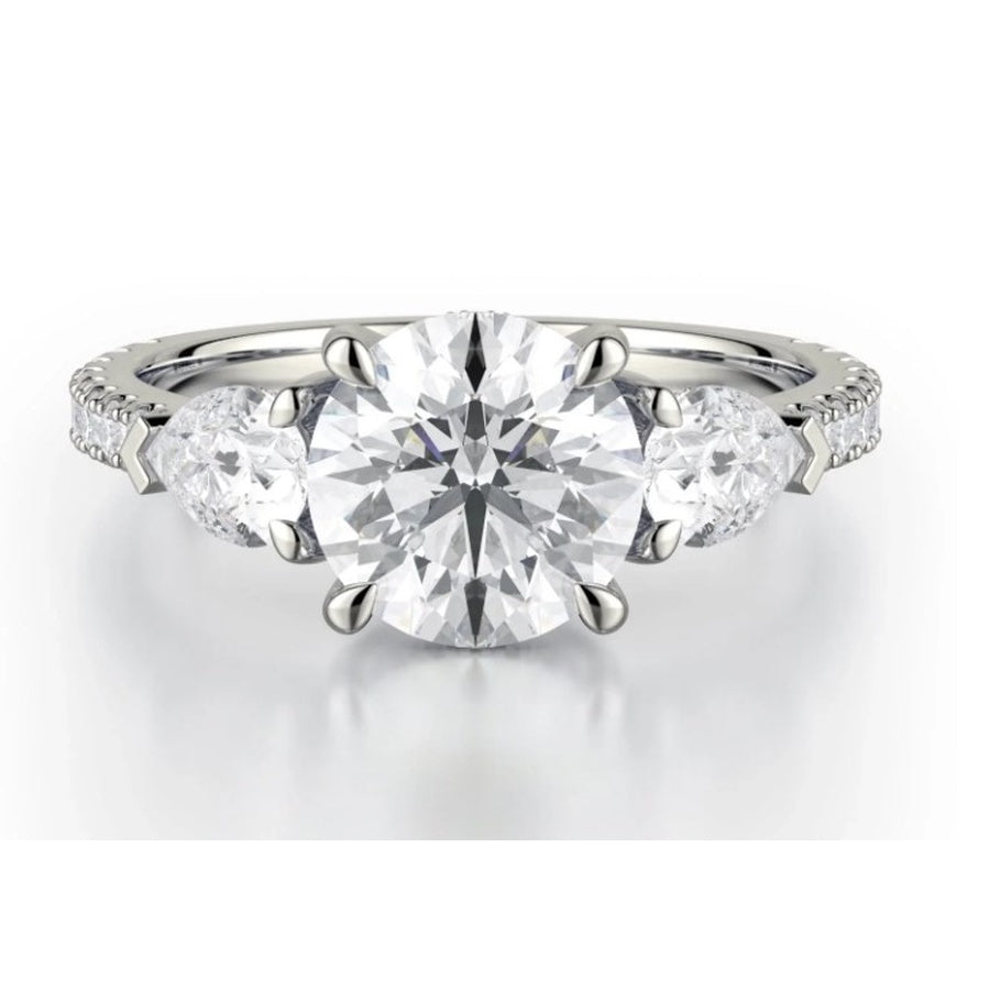 1.5CT Round C/Z Center Stone set with 2=.36CT Vs G pear Shape diamonds and 38=.31CT VS G on the shoulders of this 18K White Gold Ring in Finger Size 6.5