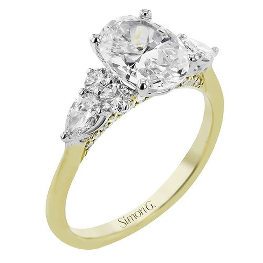 3.00CT (8.00mm x 10.00mm) Oval C/Z Center Stone is set in gorgeous Oval-Cut Three-Stone 18 Yellow Gold White Head Engagement Ring is set with a sparkling combination of round and pear diamonds. Also, highlighted in this ring is a line of brilliant diamonds along its bridge. Finger size 6.5.