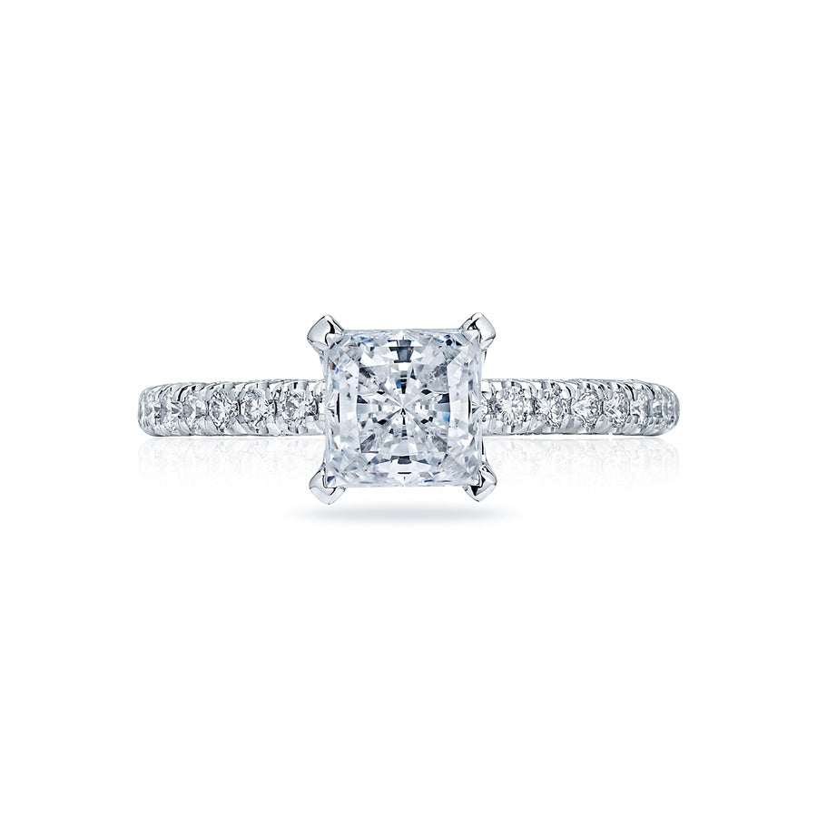 Grandstanding a1.00CT(5.5MM) Princess C/Z Center Stone upon rounded diamond body with 18K White Gold Tacori signature diamond crescents profile. Total diamond weight of .34ctw in matching VS G quality. Finger size 6