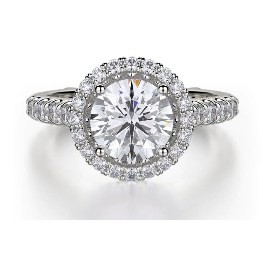 1 CT C/ZCenter stone along with 37=.90CT VS G diamonds. A round halo illuminates a prong-set center diamond on EUROPA R440-1.5. U-set side diamonds add sparkle to a uniquely curved band for a structural, elegant appeal. 18K White gold Finger sizs 6.5