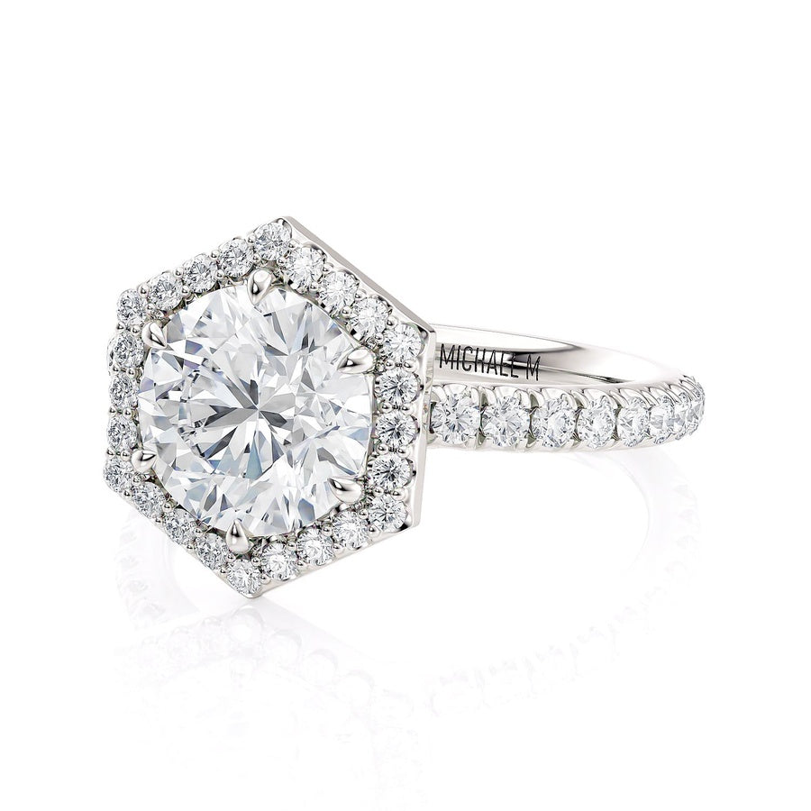 1.5CT (7.5MM) Round C/Z Center Stone set in a Hexagon Halo Style with 46=.60TW VS G Diamonds in 18K White Gold in Finger Size 6.5