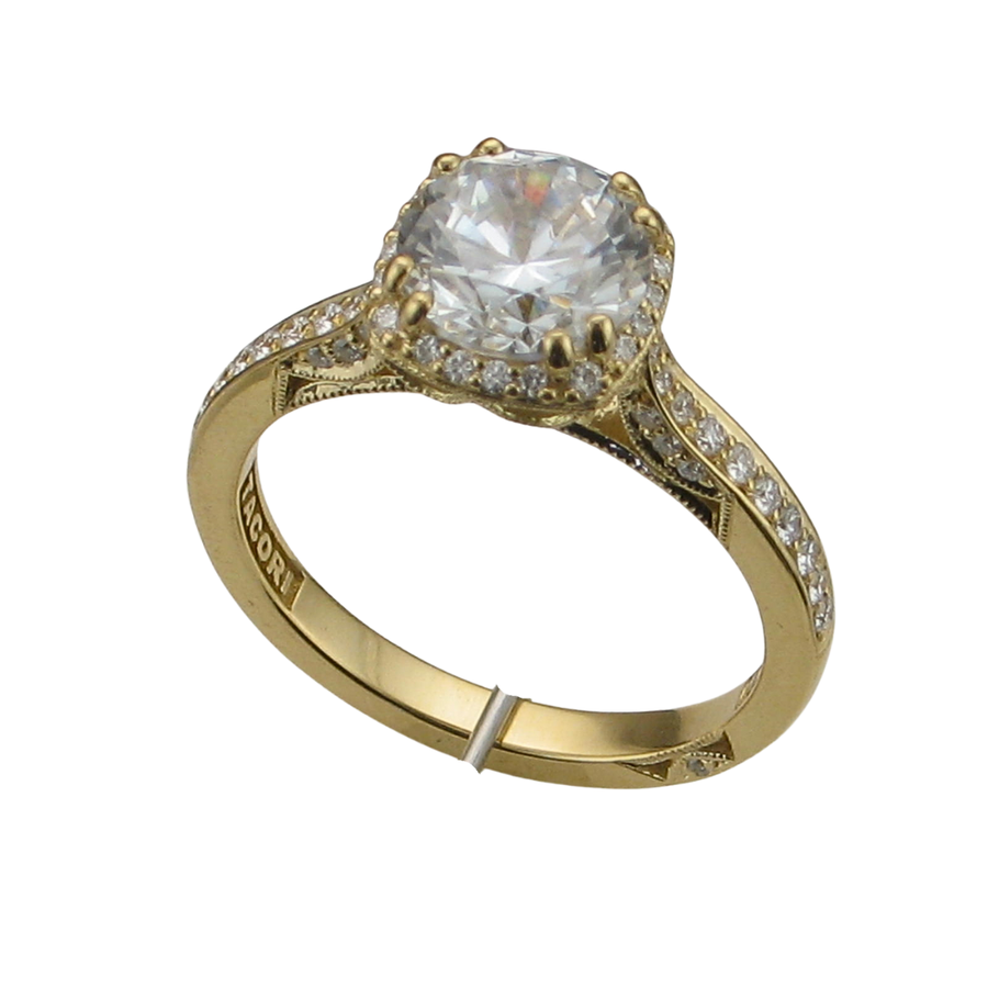 1.50CT(7.5MM) Round C/Z Center Stone with a Bloom of Diamonds Surrounding the center stone 54=.29TW VS G Diamonds set down the shoulders of the 18K Yellow Gold Ring. Finger Size 6.5 From the Dantela Collection