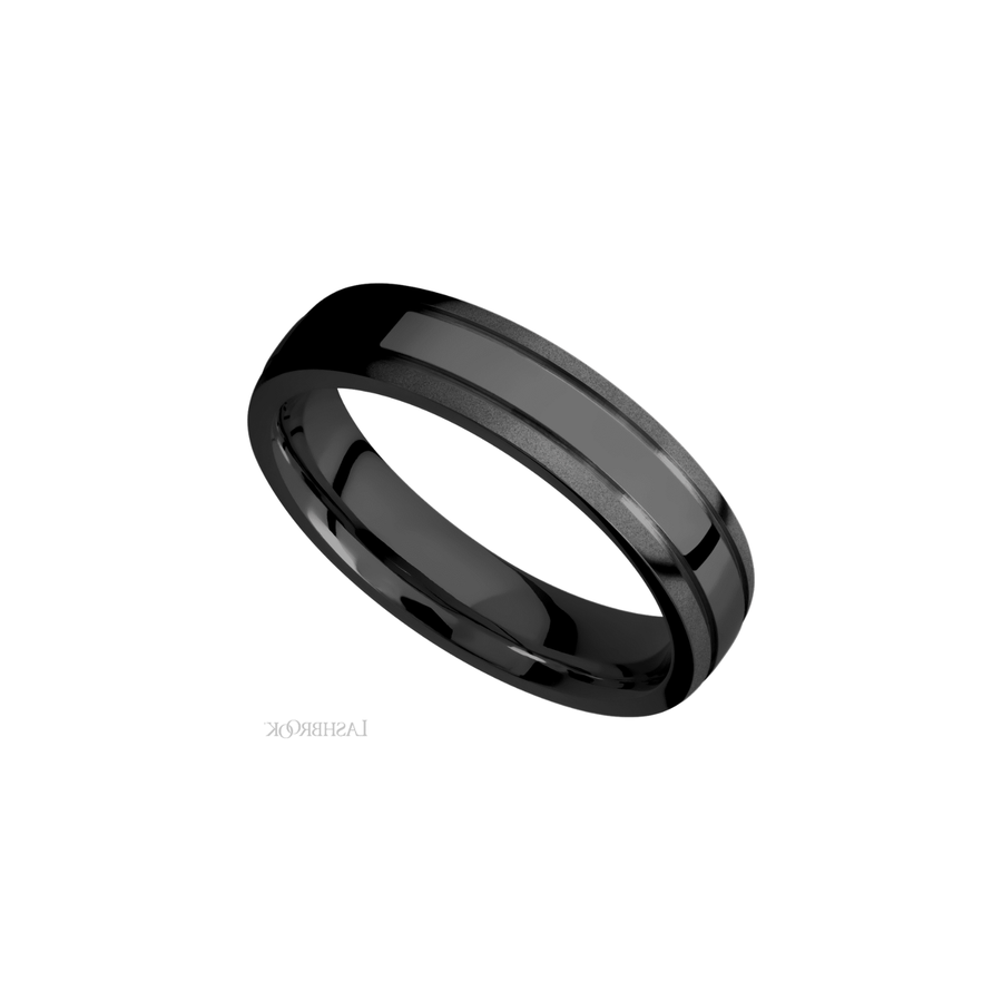 MENS 5MM WIDE DOMED BLACK ZIRCONIUM BAND WITH TWO ACCENT GROOVES, POLISH AND BEAD FINISH IN FINGER SIZE 7