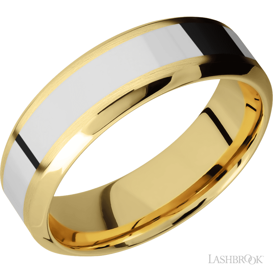 14KY7HB13/14KW 7 mm wide/High Bevel/14K Yellow Gold band with one 3 mm Centered inlay of 14K White Gold.