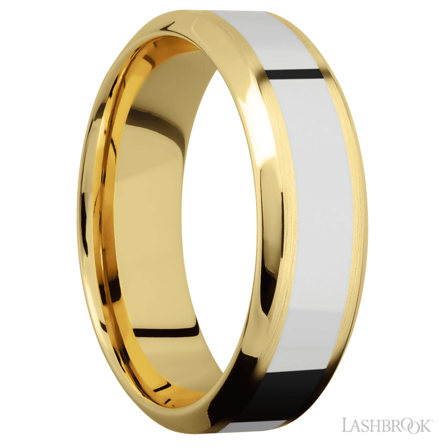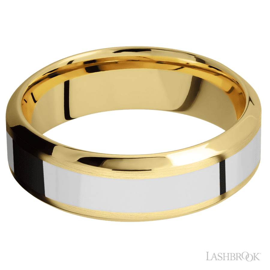 7 mm wide/High Bevel/14K Yellow Gold band with one 3 mm Centered inlay of 14K White Gold.
