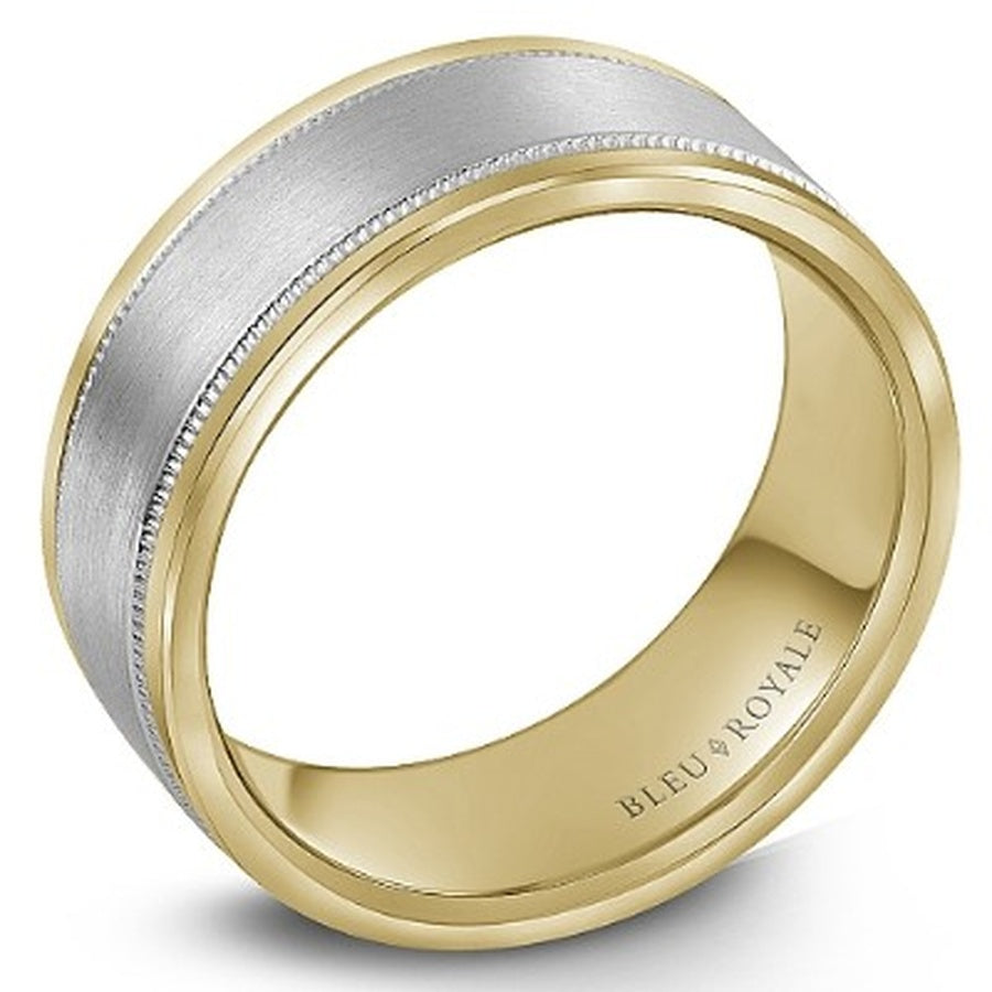 8.5MM WIDE 14K YELLOW GOLD BAND WITH 950 PALLADIUM INSERT AND MILLGRAIN. SANDPAPER CENTER AND HIGH POLISH EDGES FINGER SIZE 10