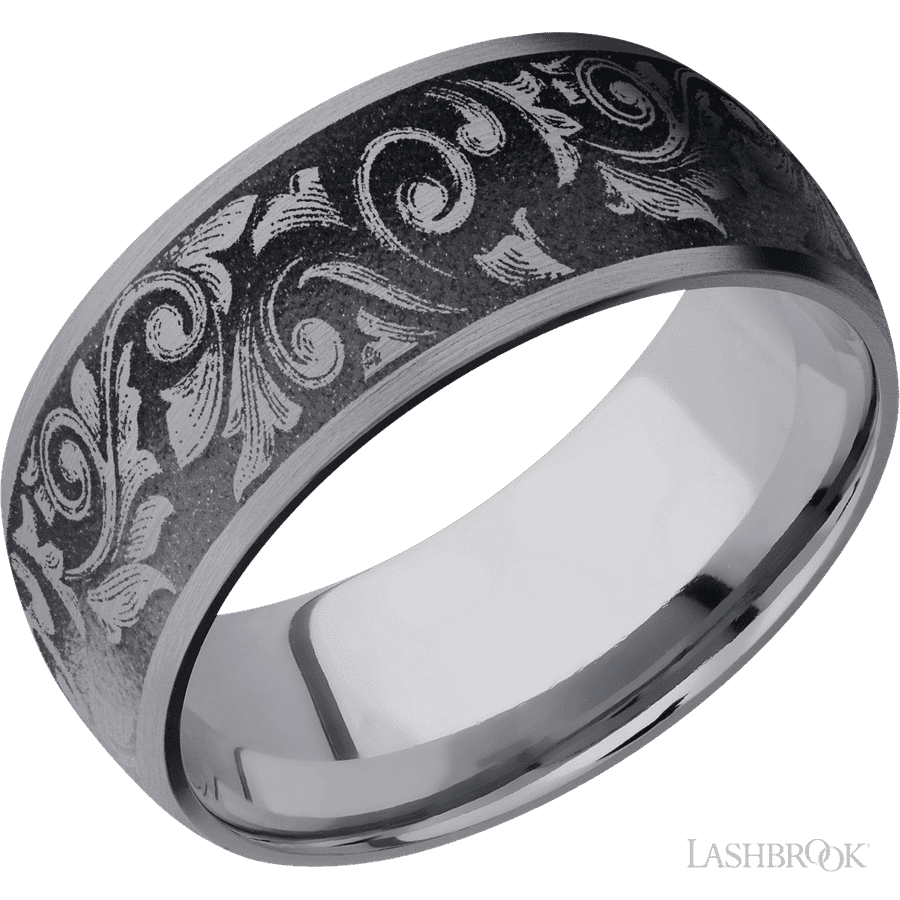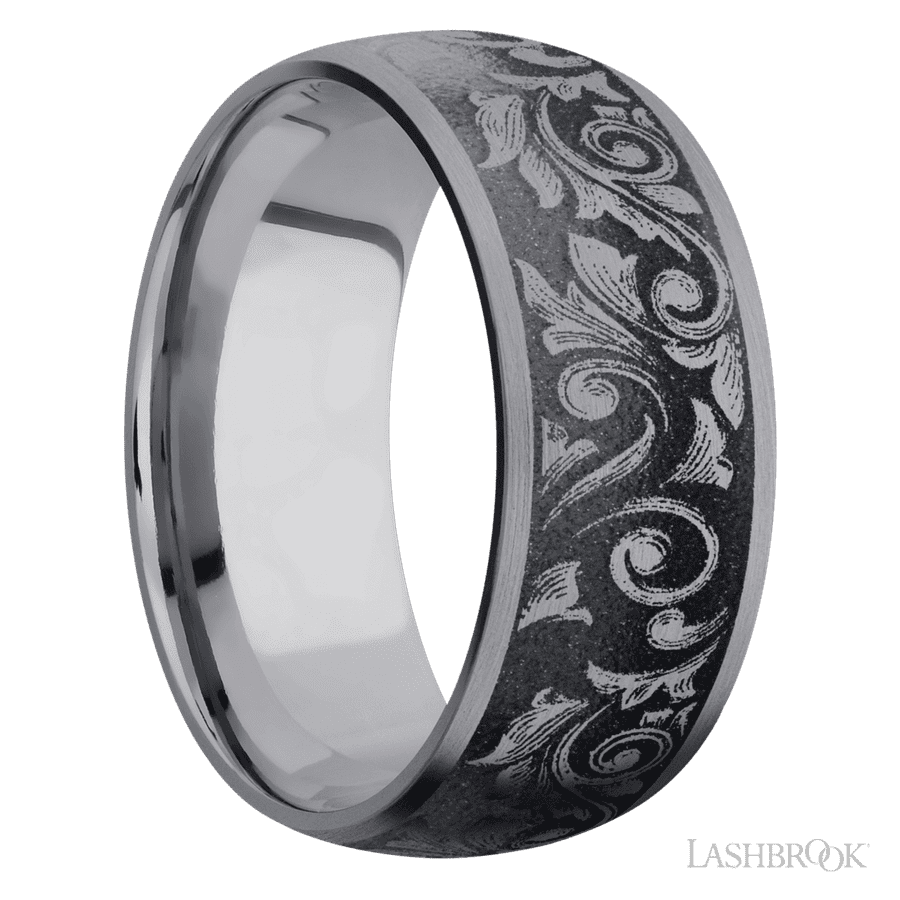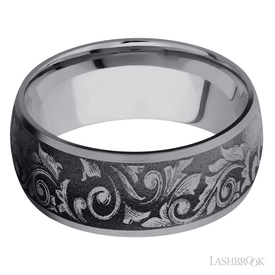 9 mm wide/Domed/Tantalum band with a laser carved Western Scroll pattern.