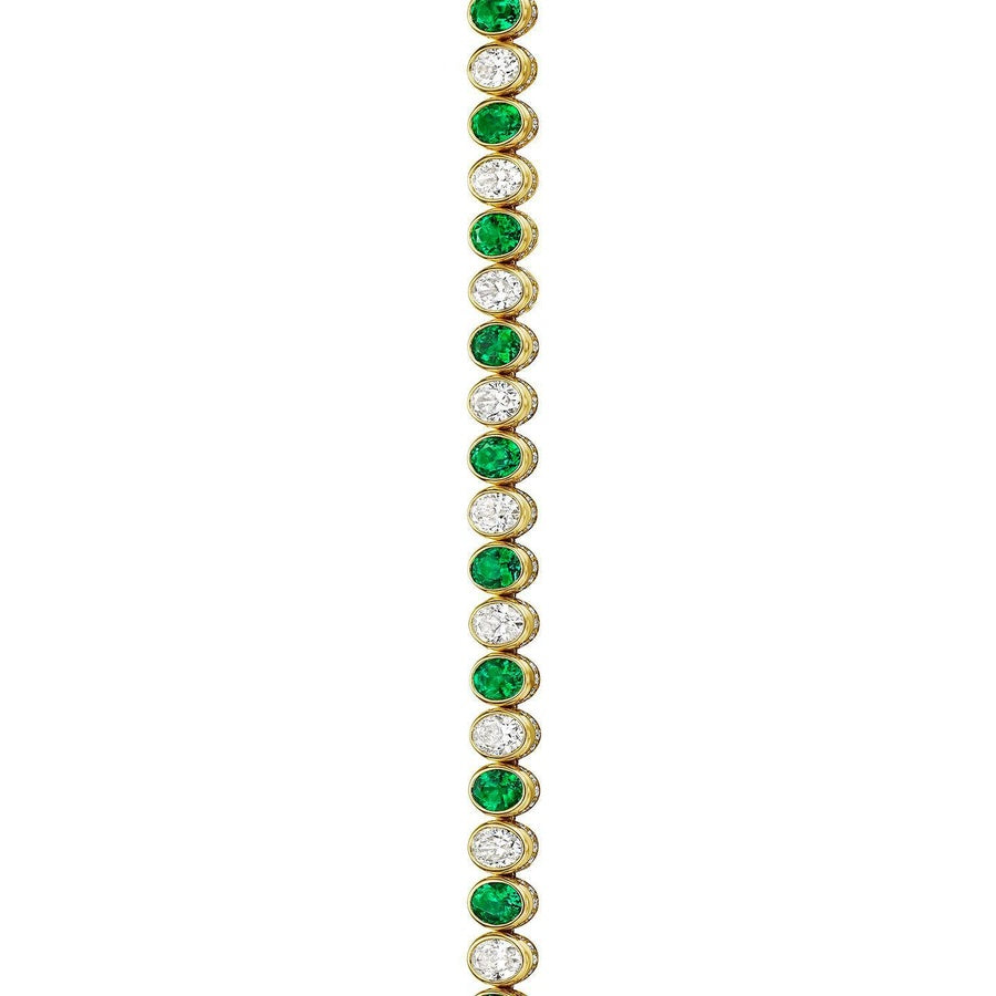 Alternating oval cut emeralds and diamonds are meticulously bezel set in luminous frames of 18k yellow gold.