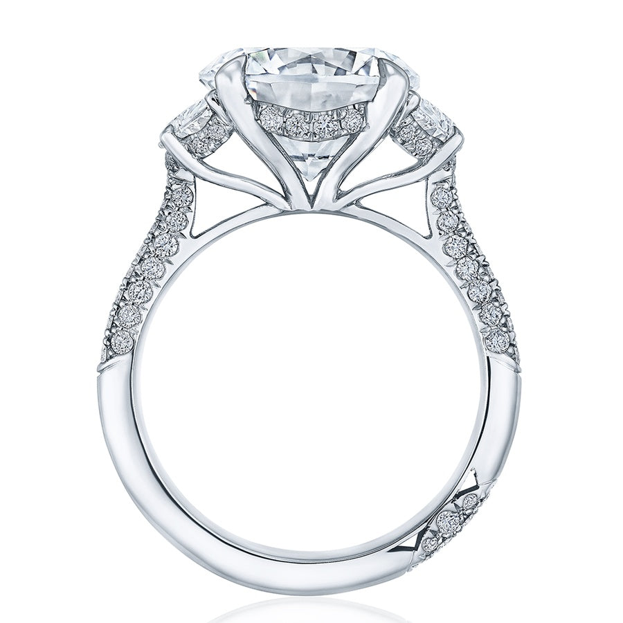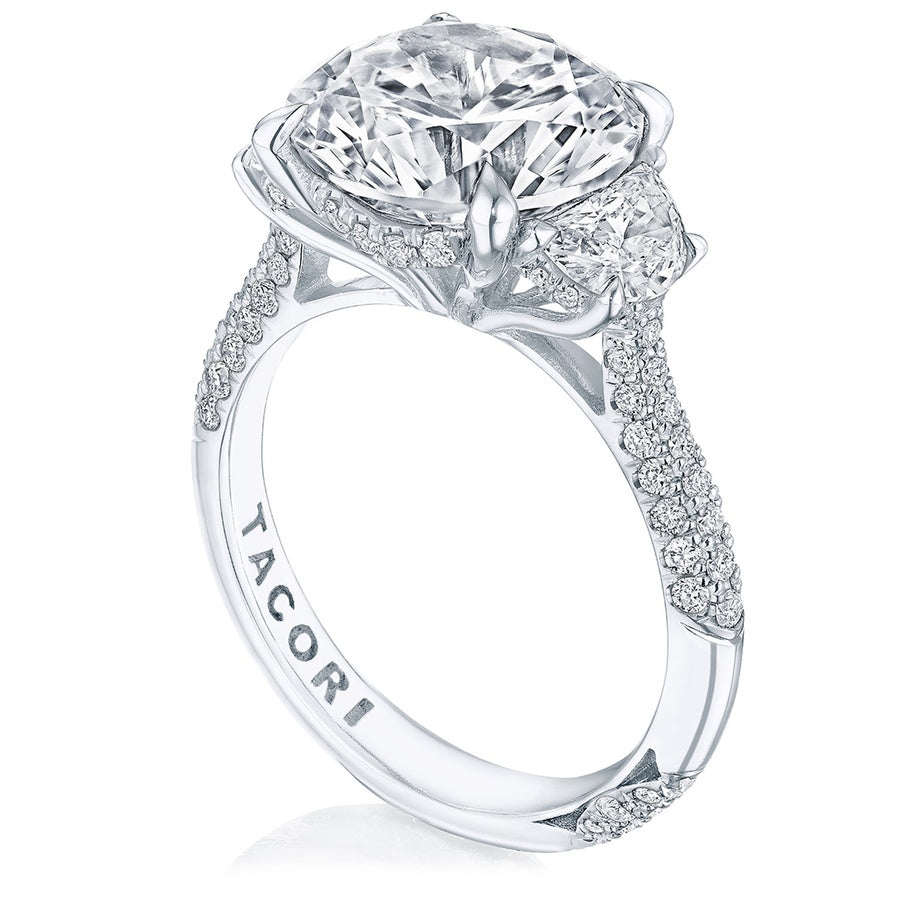 Designed by our Founder, Haig Tacorian, this 3-stone ring on a diamond-intense band features two half-moon side stones that embrace the round-brilliant cut center. Discover the diamond-intense Tacori crescent signature.