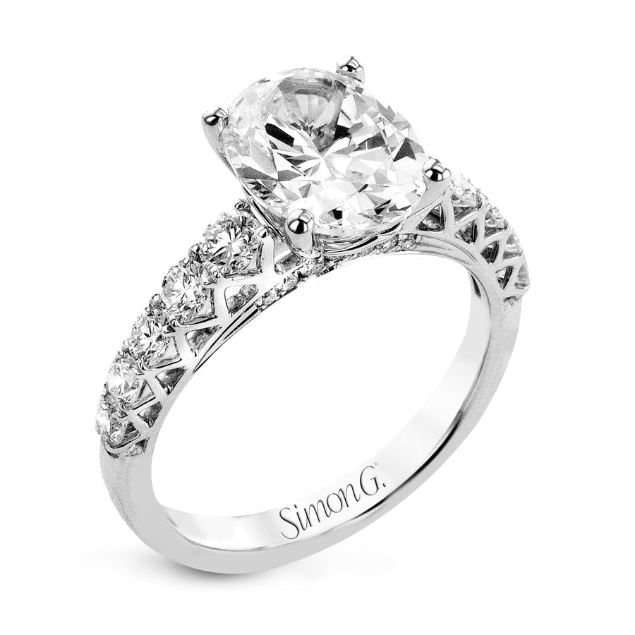 2.50CT (10X8MM) Oval-Cut Cubic Zirconia Platinum Engagement Ring. This stunning engagement ring features a distinctive design set with 24=.71CTW VS2 G large, sparkling diamonds half-way down the shank. Finger size 6.5