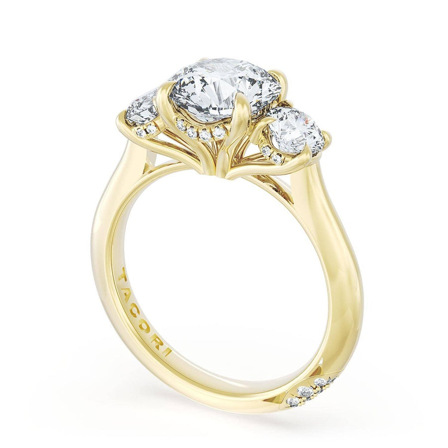 This 3-stone ring on a high polish band features a round brilliant center and matching round side stones, each accented with a hidden bloom. The ring is finished with a diamond-studded Signature Crescent.